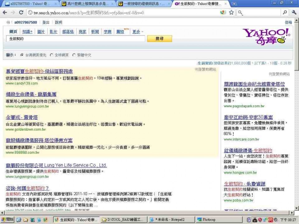 就「殯葬」「禮儀師」「生前契約」「塔位」,有時能排到前幾頁